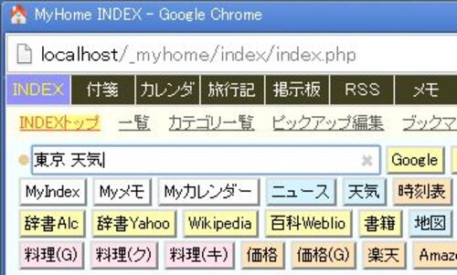 MyHome Portal Ver.6.14をリリースしました。 http://ok2nd.web.fc2.com/download.html 「INDEX」検索文字入力テキストボックスに、クリアボタン(×)を付けました。jQueryプラグインaddclearを使っています。 「INDEX」の検索ボタン「価格(G)」「楽天」「Twit…